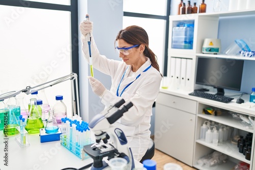Young hispanic woman wearing scientist uniform using pipette at laboratory