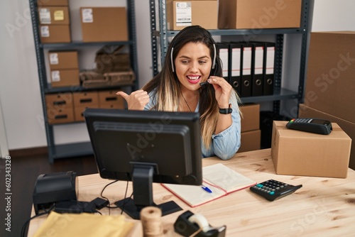 Young hispanic woman working at small business ecommerce wearing headset pointing thumb up to the side smiling happy with open mouth