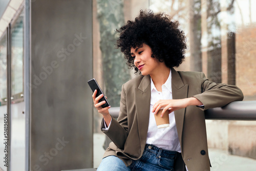 young latin woman with a coffee sitting using her mobile phone while waiting the bus, concept of communication and urban lifestyle