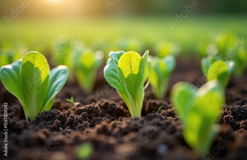 Young lettuce sprouts emerging from dark soil in vibrant garden bed. Soft morning sunlight illuminates tender green leaves, suggesting healthy growth, organic cultivation. Ideal for concepts of