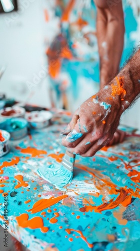 Young Male Artist in Creative Studio Painting by Hand during Daytime, Expressing Imagination through Colorful Designs, Captured with Authentic Natural Lighting