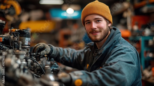 Young male automotive technician repairing a car engine in a busy garage workshop setting.