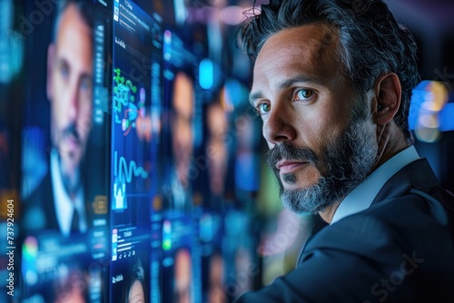 Young Male Executive Working Late at Contemporary Broadcast Control Room