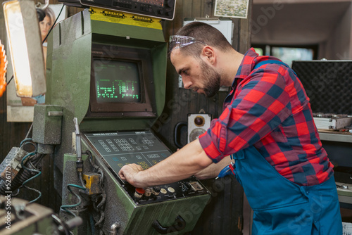 Young male mechanic with safety glasses on his head operating the machinery