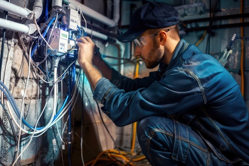 Young Male Plumber makes wiring of sewer pipes Young Male Plumber makes wiring of sewer pipes