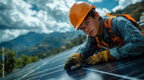 Young Male Renewable Energy Installer Working Outdoors On A Mountaintop Area With Solar Panels On The Background During Daytime And Clouds In The Sky with Safety Gear And Tools. Focusing On