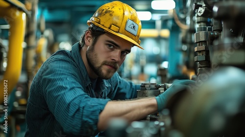 Young Male Worker in Yellow Safety Helmet Performing Maintenance on Industrial Machinery in Engineering Workshop during Daytime Hours