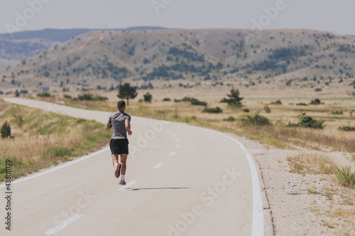 Young man and woman in protective masks running and doing exercises outdoors in the morning. Sport, Active life Jogging during quarantine. Covid-19 new normal. High quality photo. Selective focus.