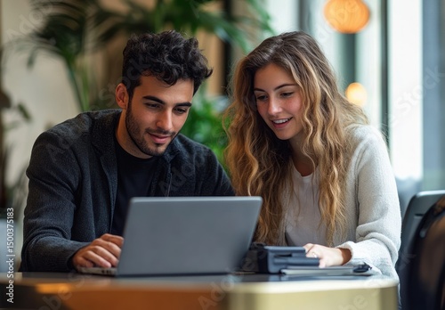 young man and woman sitting in a cozy indoor space looking at a tablet together with interest and smiles around them