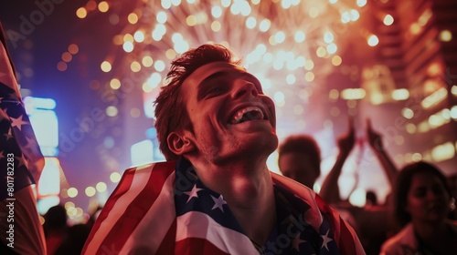 Young Man Celebrating at a Patriotic Firework Display with american flags