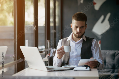 Young man drawing template for the web site associated with digital marketing, current trends and tendencies of UX / UI design. Businessman who rules his company remotely, like a freelancer