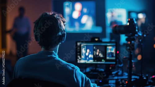 Young Man Editing Video in Modern Studio with Computer Setup