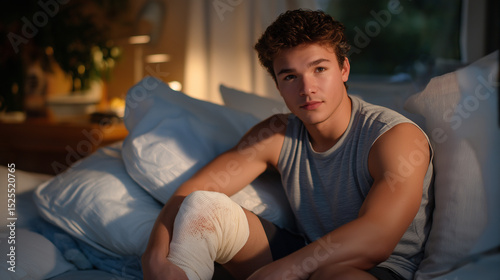 Young man elevating injured leg at home with bandage and pillows