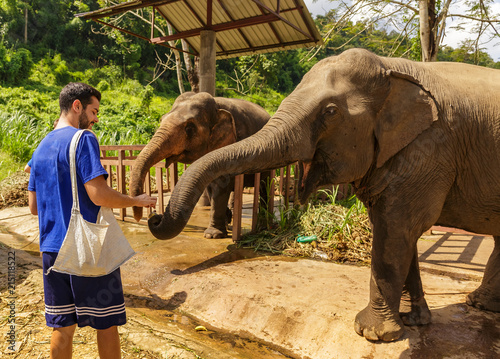 Young man feeds elephants with bananas in a sanctuary in the jungle of Chiang Mai in Thailand
