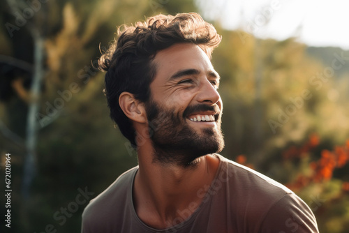 Young man hiker smiling on nature background.