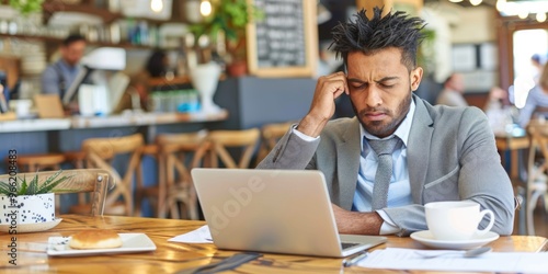 Young man in a suit working intently on a laptop in a coffee shop during the afternoon