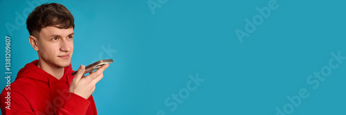 Young man in red hoodie talking to smartphone microphone against blue studio background. Concept of voice message, digital communication, online presence, lifestyle, modern tool, daily interaction.