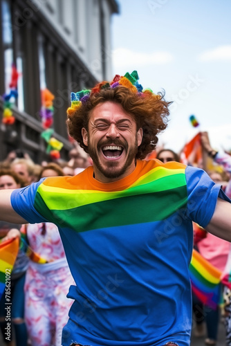 Young man jumps and dances during the demonstration for gender equality. Happy boy with gay pride flag on shirt laughs looking at camera. Concept of freedom and lifestyle