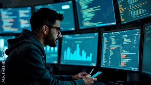 young man sitting front multiple computer monitors dark room wearing hoodie glasses appears focused his work monitors displaying various programming code graphs man holding smartphone his hand seems