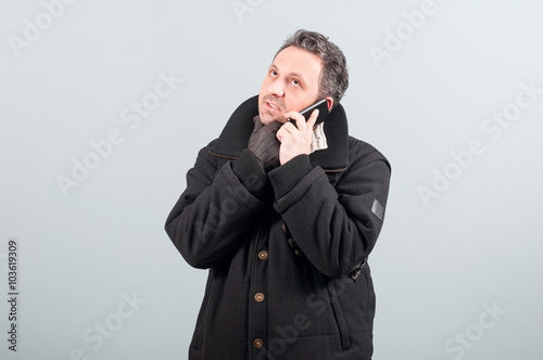 Young man thinking while talking on cellphone