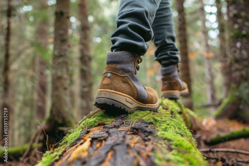 Young man walking on a mossy log in the forest, Traveler or hiker man balancing while standing on a tree trunk in nature. Men enjoy outdoor activities in the summertime. close-up of shoes. back view.M