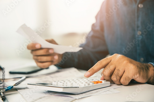 Young man was using a calculator to calculate his income and expenses. In his hand there were bills to pay a lot in debt.