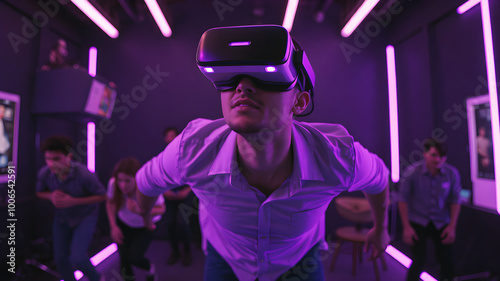 Young man wearing VR headset enjoy playing video game and levitating in the air on futuristic purple cyberpunk neon light banner background. Metaverse technology concept.