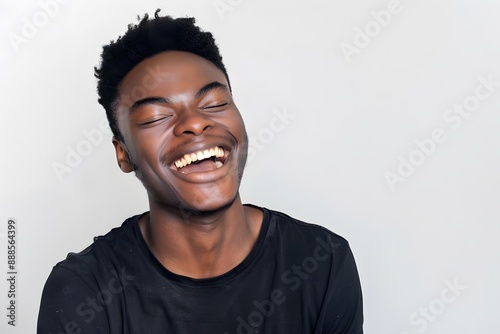 Young man with a big smile, enjoying a joyful and carefree moment against a plain background.