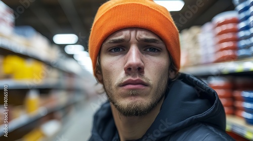 Young man with a serious expression wearing an orange beanie in a supermarket aisle.