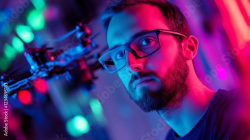 Young Man with Beard and Glasses Posing with Drone in Neon Light