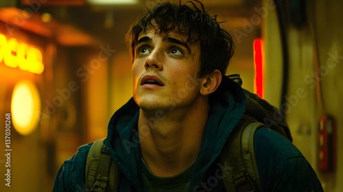 Young Man with Hopeful Expression Looking Upward in an Urban Indoor Environment with Soft Lighting