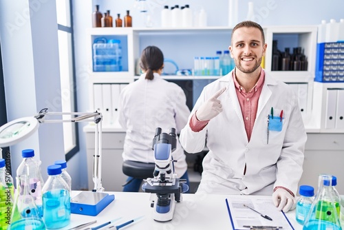 Young man working at scientist laboratory smiling happy pointing with hand and finger