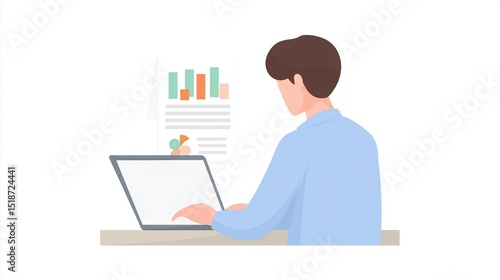 Young man working on laptop in modern office environment, analyzing data charts and reports, showcasing productivity and focus in a professional setting