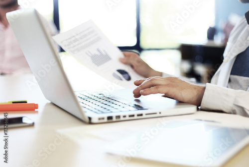 Young man working with laptop, man hands on notebook computer, business person at workplace