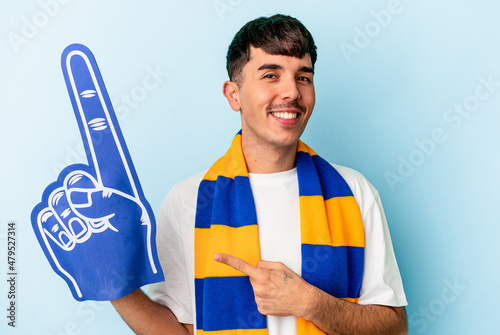 Young mixed race fan man isolated on blue background smiling and pointing aside, showing something at blank space.