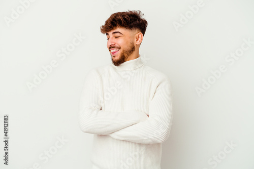 Young Moroccan man isolated on white background funny and friendly sticking out tongue.