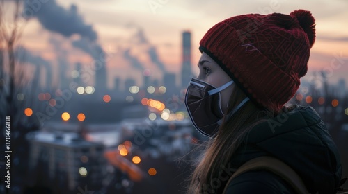 Young person in a mask, pollution backdrop, emphasizing climate-related health effects