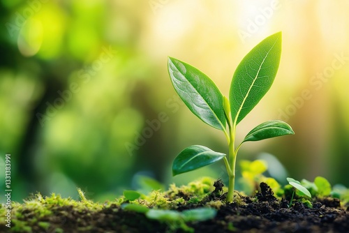 Young Plant Sprouting with Sunlight Filtering Through Leaves: Symbolizing environmental protection, eco-friendly practices, or sustainable development