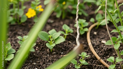Young Plants Growing in a Garden Bed with Mulch and Support String
