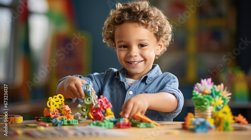 Young preschooler makes a paper and paint craft for classroom lessons