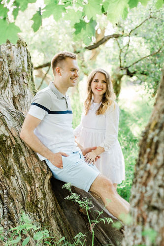 Young pretty couple in love lying on tree in park. Handsome cheerful blonde girl in white dress hugging her boyfriend. Man and woman having fun outdoors