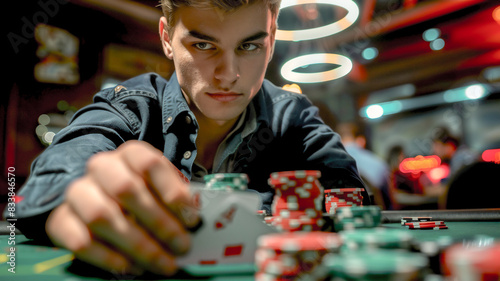 Young professional gambler playing poker seriously .