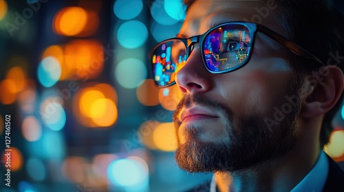 Young Professional with Glasses Reflecting Urban Night Lights and Colorful Bokeh Background