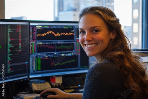 Young professional woman smiling while working in a modern office with multiple computer screens displaying stock market data and financial charts