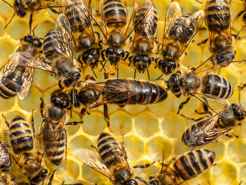Young queen bee surrounded by bees. Queen bee the mistress of the colony of bees.