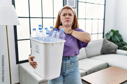 Young redhead woman holding recycling wastebasket with plastic bottles cutting throat with hand as knife, threaten aggression with furious violence