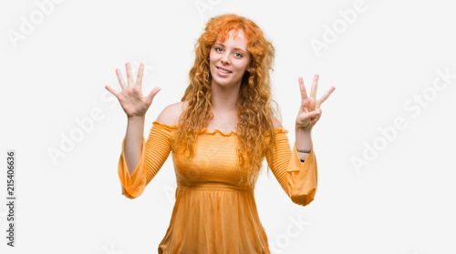 Young redhead woman showing and pointing up with fingers number eight while smiling confident and happy.
