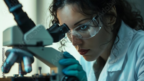 Young scientist is carefully looking into a microscope while working on a research project in a laboratory.