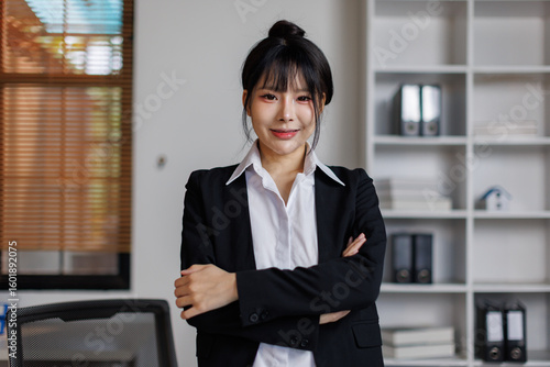 Young smiling business woman standing arms crossed in office looking at camera. Portrait.