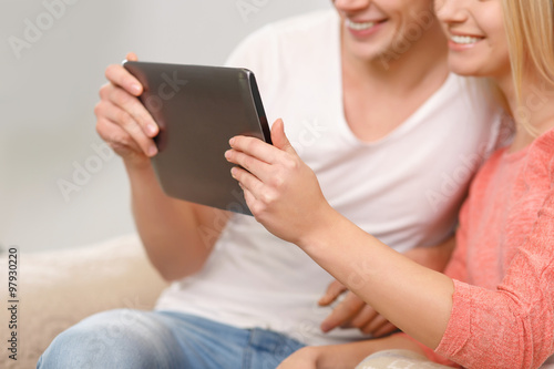 Young smiling couple using tablet.